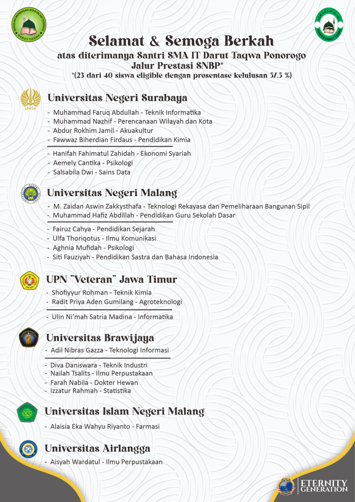 Pencapaian ini tentu menjadi kebanggaan bagi keluarga besar SMA IT Darut Taqwa Ponorogo. Semoga para santri terus mengukir prestasi dan membawa nama baik almamater mereka di jenjang pendidikan yang lebih tinggi. (***)