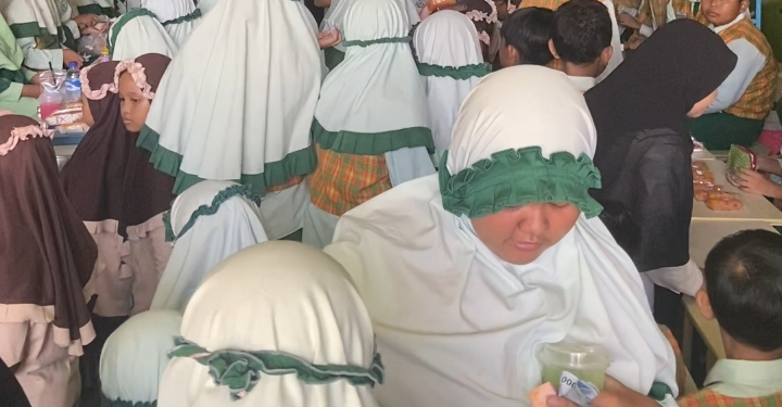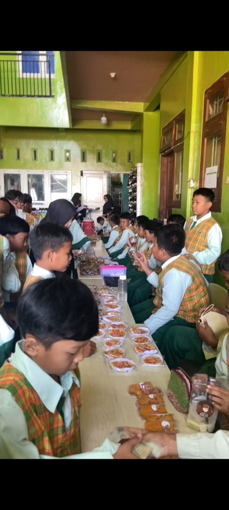Beragam makanan ringan dan minuman dijajakan dengan penuh percaya diri. Para siswa terlihat aktif menawarkan produk kepada teman maupun guru, menciptakan suasana jual beli yang seru, hidup, dan penuh keceriaan.