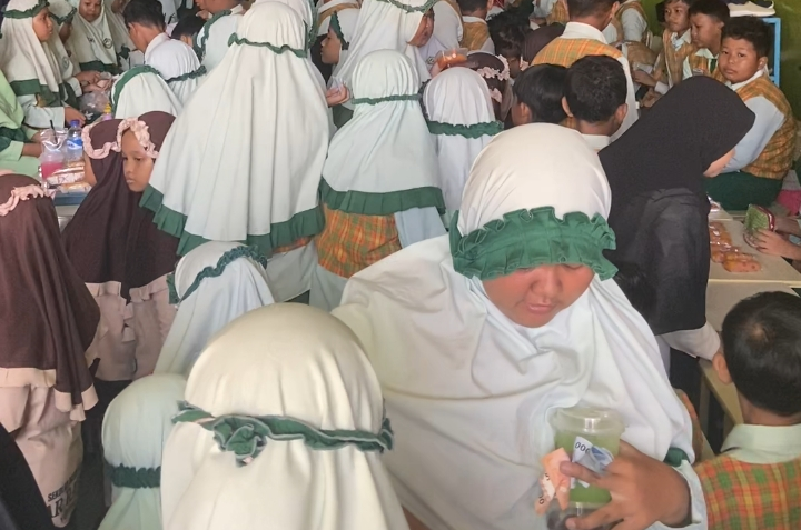 Area sekolah yang biasanya tenang berubah menjadi layaknya pasar mini yang ramai dan penuh semangat. Para siswa tampil sebagai “pengusaha cilik” dengan membawa berbagai dagangan.