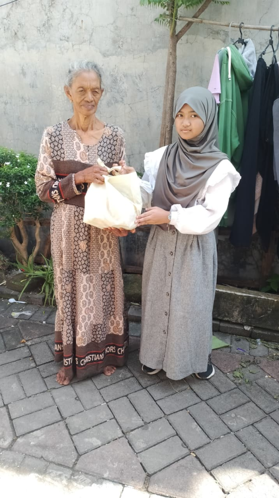 Sementara siswa kelas 5–6 menyerahkan 200 paket sembako kepada warga sekitar sekolah.