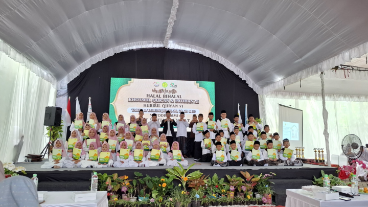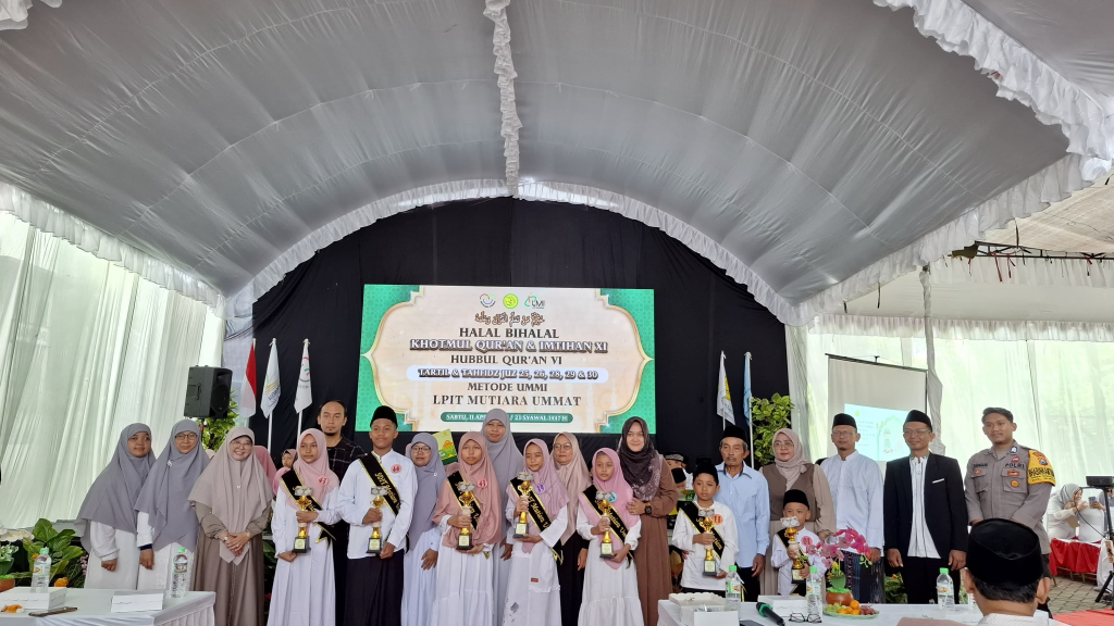 Di tengah panggung, layar videotron menampilkan tulisan besar bertajuk “Halal Bihalal, Khotmul Qur’an dan Imtihan Al-Qur’an Metode UMMI dan Tahfidz Juz 25 sampai Juz 30”.