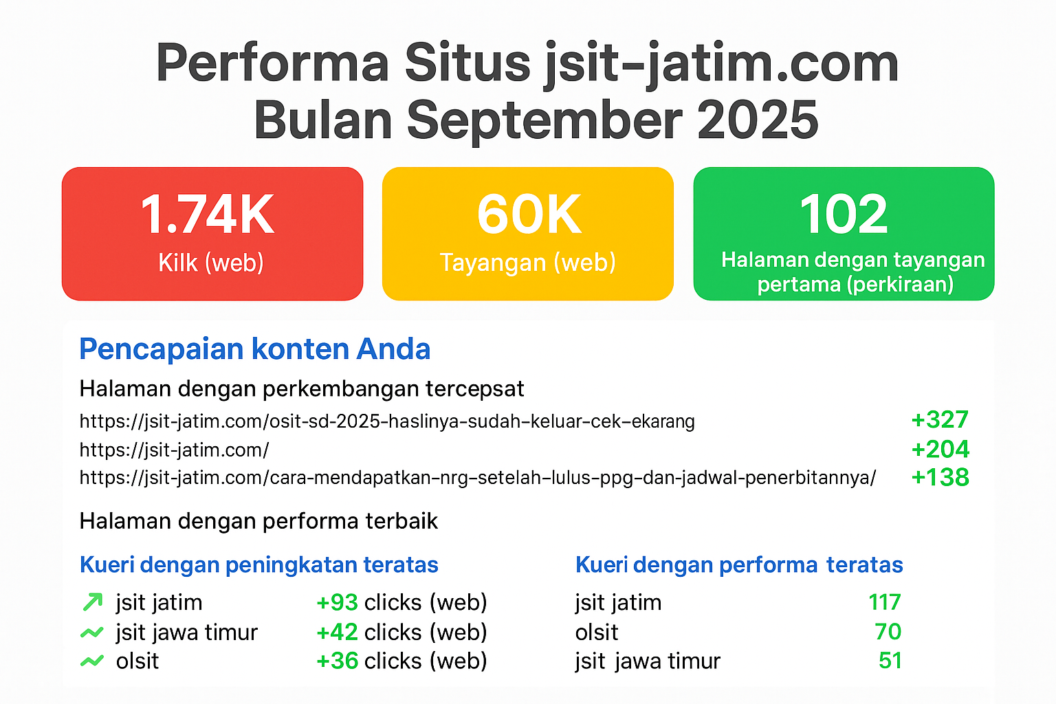 Surabaya – Situs resmi JSIT Jawa Timur, jsit-jatim.com, mencatat performa gemilang sepanjang September 2025. Berdasarkan laporan Google Penelusuran, laman ini berhasil mengumpulkan 1.740 klik dengan 60 ribu tayangan hanya dalam satu bulan. Angka tersebut menjadi bukti bahwa kehadiran web ini semakin dikenal masyarakat, terutama kalangan sekolah, guru, dan orang tua.