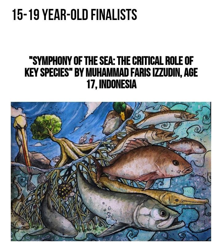 Faris, yang merupakan alumni SMPIT Nurul Izzah Angkatan 2 dan putra dari Ustadzah Susi Ratnaningsih, mengangkat tema besar tentang pentingnya spesies kunci dalam menjaga keseimbangan ekosistem laut. Karya visualnya memukau dengan gambaran ekosistem laut yang dinamis, lengkap dengan spesies-spesies penting seperti Tarpon, Snapper, Snook, Alligator Gar, hingga Bull Shark, semuanya digambarkan berenang harmonis di perairan biru kehijauan.